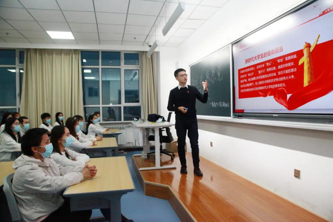 在新疆医科大学第三临床医学院检验技术2019-2班,班主任雷程正在讲述中国共产党矢志不渝为人民服务的奋斗历程。雷程说,“我们党坚持为人民服务,不仅仅是一句口号,而是坚持不懈的实际行动!作为一名当代大学生,我们要以不断向党靠近,以一名共产党员的标准要求自己,时刻牢记为人民服务的宗旨。”老师深情的讲述,将那段峥嵘岁月娓娓道来,更深刻揭示出人民性是中国共产党最鲜明的底色。生动的故事、有力的语言、饱满的激情,让台下的同学们听得入迷,也让新医学子对中国共产党的认识不断加深,更加坚定了感恩党、跟党走的信念。