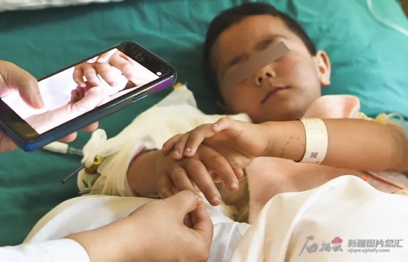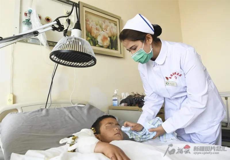 5月6日,新疆医科大学附属中医医院医护人员观察小麦的手臂恢复情况。记者汤永摄