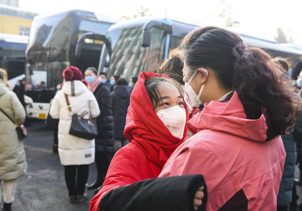 ↑2020年1月28日,在新疆医科大学院内,医疗队队员刘春花(右)与女儿任书瑶拥抱告别。