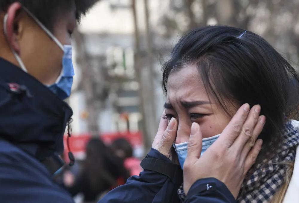 ↑2020年1月28日,在新疆医科大学院内,医疗队队员、新疆医科大学第一附属医院重症监护室医护人员吕俊(左)为未婚妻王鹤擦去眼泪。