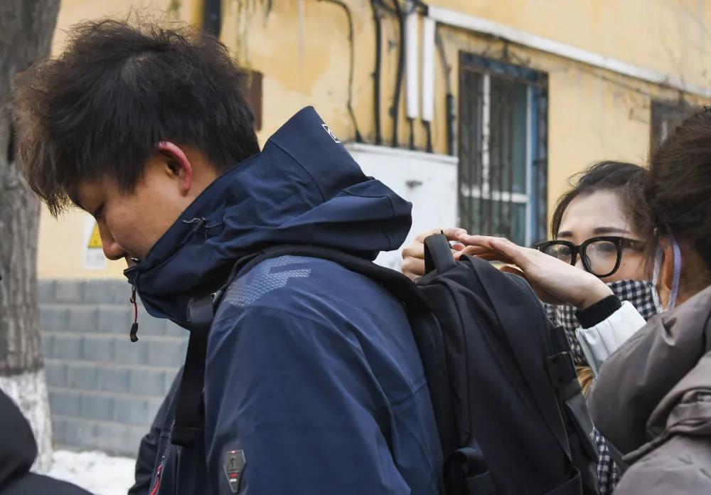 ↑2020年1月28日,在新疆医科大学院内,医疗队队员、新疆医科大学第一附属医院重症监护室医护人员吕俊(左)的未婚妻王鹤向其背包中装进一包药。