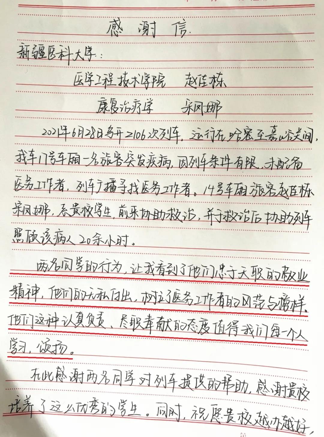 这是一封济南铁路集团有限公司济南客运段Z106列车全体工作人员写给新疆医科大学的感谢信。信中讲述了,我校医学工程技术学院大一学生赵佳栋和健康管理学院大二学生宋凤娜在火车上英勇救人的故事……