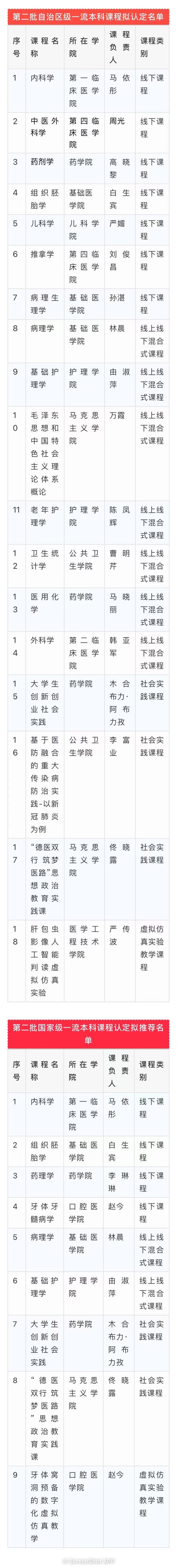 近日,自治区教育厅公示了第二批自治区级一流本科课程拟认定名单及国家级一流本科课程认定拟推荐名单,我校《内科学》等18门课程拟认定为自治区级一流本科课程,《组织胚胎学》等9门课程推荐申报国家级一流本科课程。