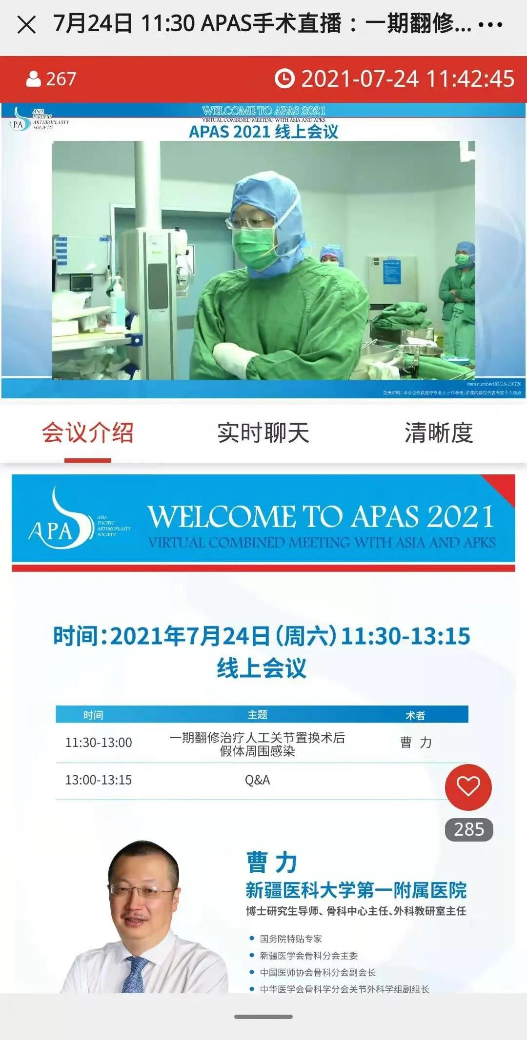 在本次会议上,新疆医科大学第一临床医学院(第一附属医院)骨科中心曹力教授作为APAS上一任主席参加开幕式并向本届主席进行交接,会议邀请了中国、澳大利亚、智利、比利时、埃及、英国、法国、印度、印尼、伊朗、日本、马来西亚、新西兰、荷兰、尼泊尔、巴基斯坦、菲律宾、新加坡等全球20余国家的骨科名医齐聚网络,以“科技时代的人工关节置换术”为主题开展了为期三天的全球关节外科先进技术交流。