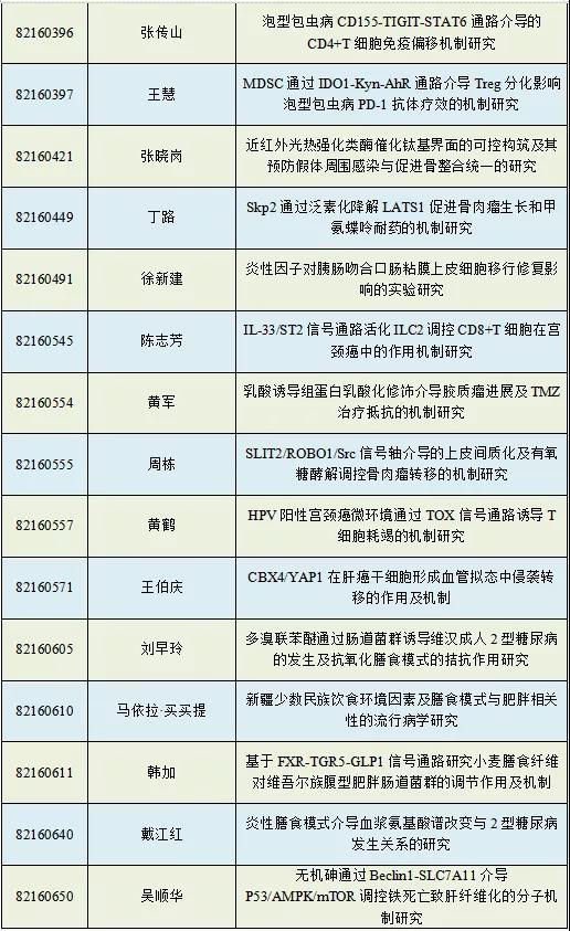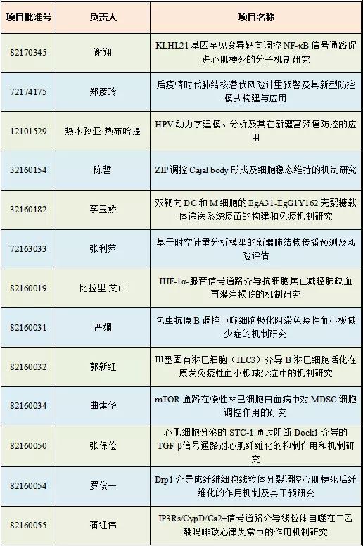 所立项项目中谢翔教授主持的《KLHL21基因罕见变异靶向调控NF-κB信号通路促进心肌梗死的分子机制研究》、郑彦玲副教授主持的《后疫情时代肺结核潜伏风险计量预警及其新型防控模式构建与应用》等获得面上项目资助;热木孜亚·热布哈提主持的《HPV动力学建模、分析及其在新疆宫颈癌防控的应用》获得青年科学基金项目资助,其中郑彦玲副教授主持的项目是我校首次在管理学部获得的面上项目,实现了零的突破。