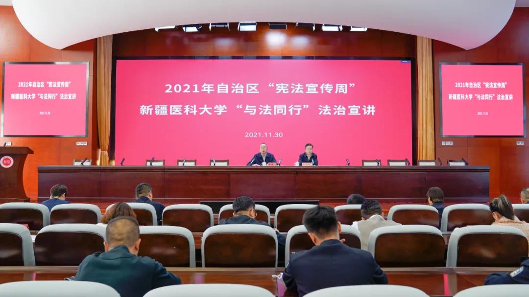 11月30日下午,新疆医科大学举行“与法同行”法治宣讲,校党委常委、副校长李勇生为新医师生们作了题为“以习近平法治思想为引领 奋力开创‘八五’普法工作新局面”的专题讲座。校党委常委、统战部部长李豫凯主持宣讲。
