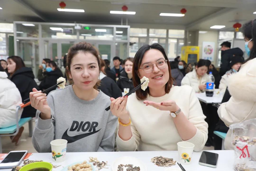 拌馅、擀皮、包饺子……校领导和老师们撸起袖子,和同学们一边包着新年的幸福饺子,一边唠着家常,高书记细心地教身边的学生包饺子的“秘诀”。大家一起动手,不一会儿功夫,一盘盘排列整齐的饺子便下锅了。
