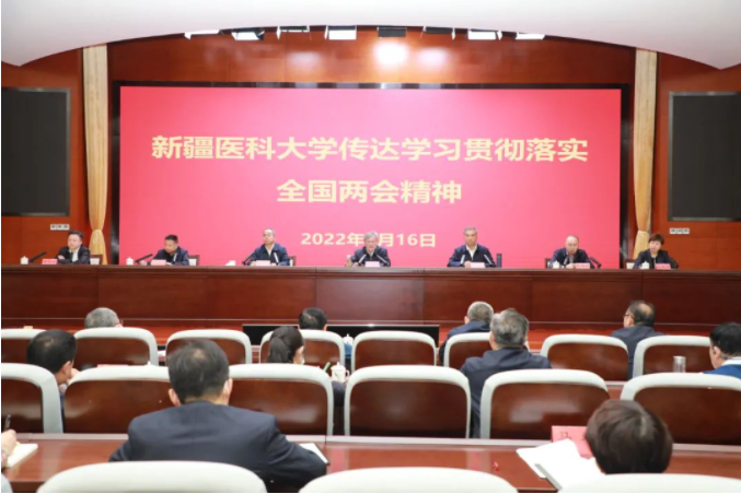 高发水书记要求,全校上下要坚决传达学习贯彻落实好全国两会精神,推动习近平总书记重要讲话精神在新疆医科大学落地生根。要提高政治站位,加强组织领导;加强宣传引导,营造浓厚氛围;结合工作实际,抓好贯彻落实。紧密结合学校实际,聚焦迎接学习贯彻党的二十大这条主线,围绕自治区教育大会精神,加强党对学校工作的全面领导,坚持立德树人根本任务,强化依法治校、质量立校、人才强校、科技兴校、文化润校,全面提高人才培养能力、医学研究能力、医疗服务能力。要对照习近平总书记的最新要求和全国两会部署,立足新发展阶段、贯彻新发展理念、服务和融入新发展格局,全方位推进学校高质量内涵式发展,努力办好党和人民满意的医科大学,以优异成绩迎接党的二十大胜利召开。