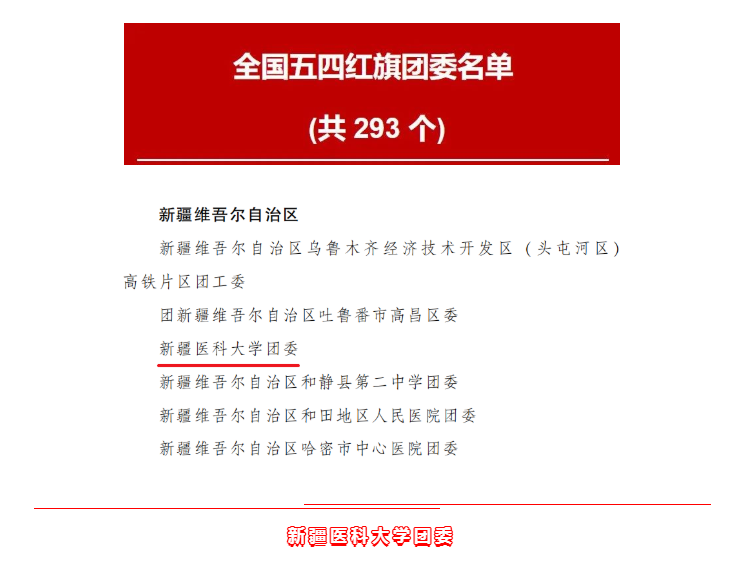 近日,共青团中央公布了《关于表彰全国五四红旗团委(团支部)、全国优秀共青团员、全国优秀共青团干部的决定》。新疆医科大学团委荣获“全国五四红旗团委”。