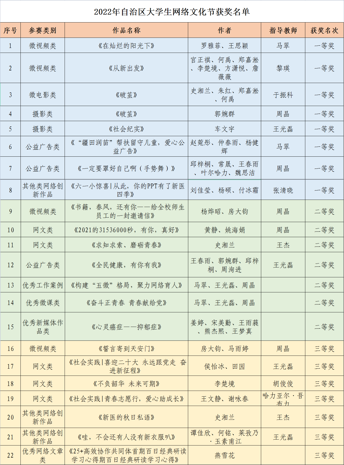 近日,2022年自治区大学生网络文化节和自治区高校网络教育优秀作品公布,新疆医科大学选送的网络文化和高校网络教育作品在各类别评选中共获得一等奖8项、二等奖7项、三等奖7项,取得优异成绩。