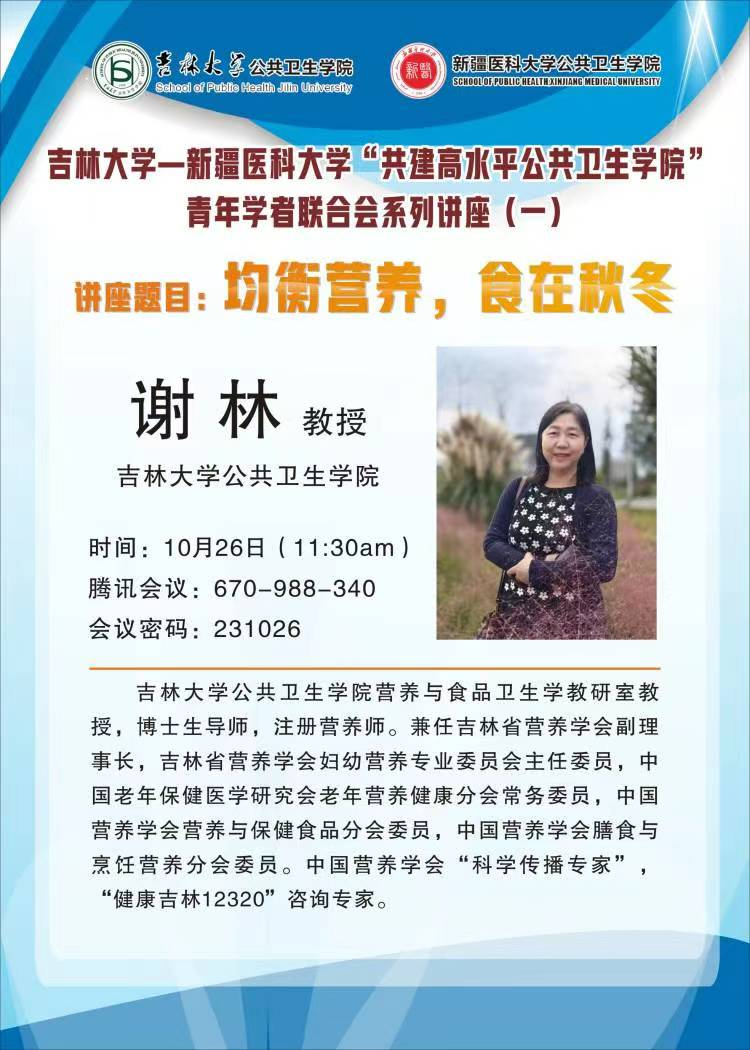 10月26日,新疆医科大学公共卫生学院青年学者联合会第一期学术交流活动顺利举行,活动邀请到吉林大学公共卫生学院营养与食品卫生教研室谢林教授。