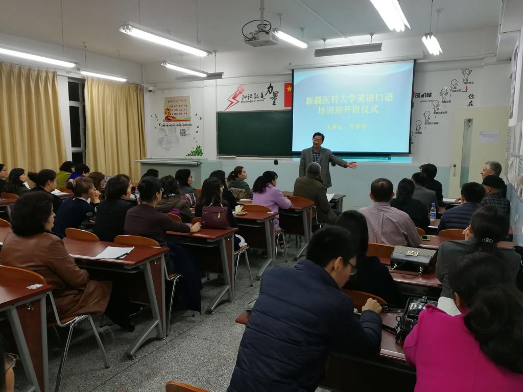 为进一步提升我校教师英语水平,提高留学生教学质量,在凯赛尔·阿不都克热木校长的安排下,2017年10月9日晚,新疆医科大学2017年英语口语培训班正式开班。