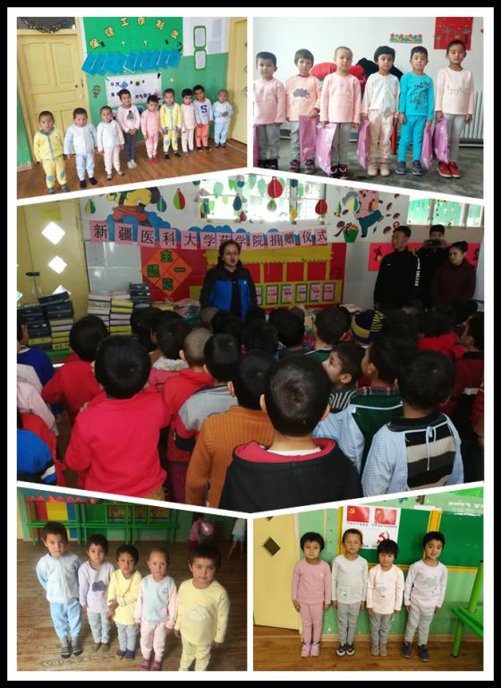 此次捐赠的爱心礼物,是药学院的教职工们向贫困家庭的孩子们送出的关爱和温暖。有保暖内衣81套、纯棉背心81条、纯棉内裤162条,还有各种孩子们的新衣物134件、鞋子15双、书包3个、玩具1包,共计善款7500元,这些爱心礼物为孩子们解决了燃眉之急,也为全体孩子们上了一堂生动的爱国和感恩教育课。在爱心捐赠仪式上, 小朋友们以一曲响亮的“歌唱祖国”表达了对新疆医科大学叔叔阿姨们的感恩之情。