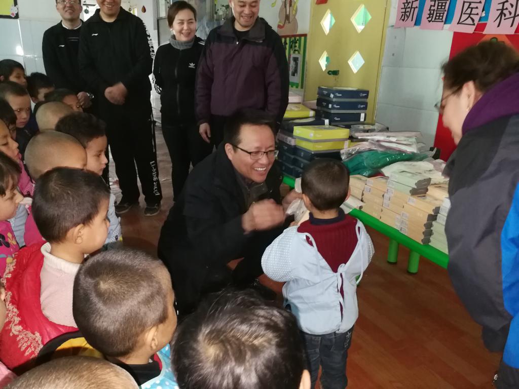 11月14日上午,在和田地区墨玉县扎瓦镇吾唐幼儿园工作的双语支教老师邬利娅·依明收到了来自乌鲁木齐的12件邮政快递包裹。打开包裹的那一刻,幼儿园里响起了孩子们开心喜悦的欢笑声,这是新疆医科大学药学院教职工为幼儿园的小朋友们送上的冬天温暖的爱心礼物。