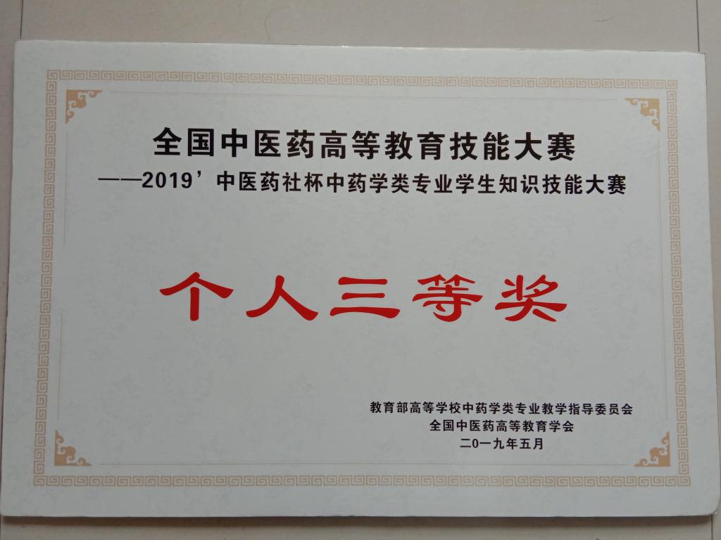 大赛经过激烈的角逐,最终我院马文鑫同学获得了个人三等奖的好成绩,孔莎莎、刘倩倩、徐若瑄荣获个人优秀奖,这是我校中药专业在历届比赛中取得的最好成绩。
