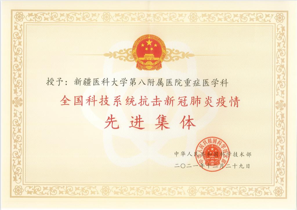 近日,国家科学技术部表彰了一批全国科技系统抗击新冠肺炎疫情先进集体和先进个人,新疆医科大学第八附属医院重症医学科荣获“全国科技系统抗击新冠肺炎疫情先进集体”荣誉称号。