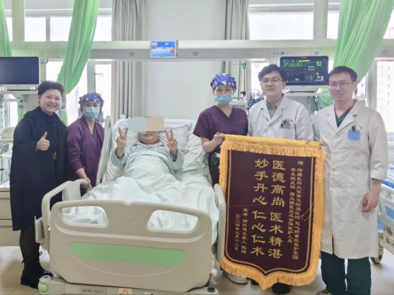 “重生”后的患者张华(化名)为医护团队送上锦旗。新疆医科大学第五附属医院供图