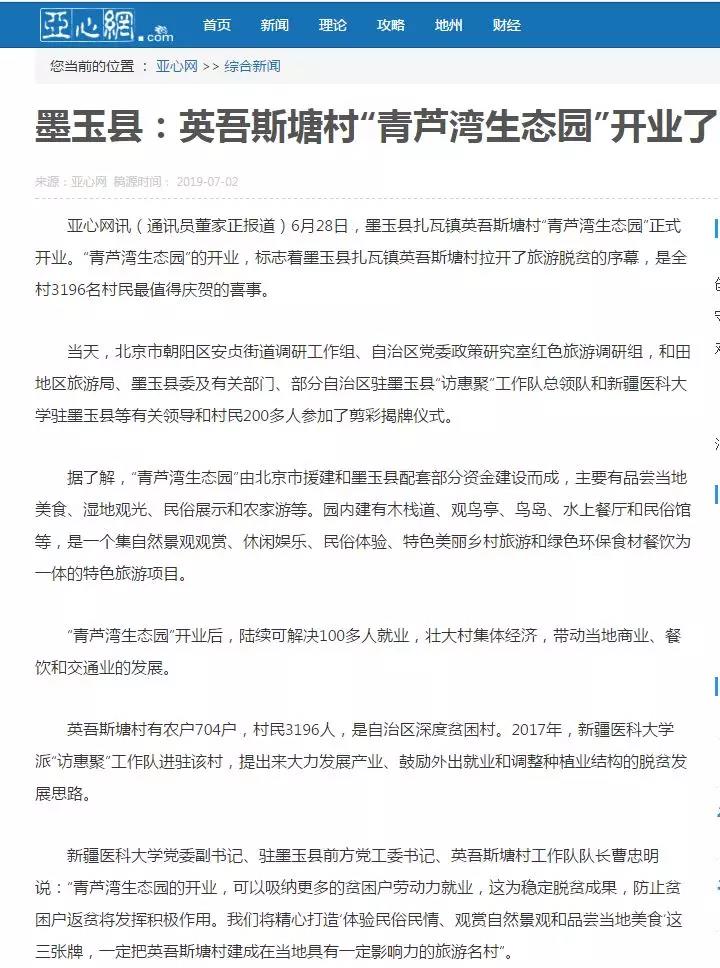 新疆医科大学党委副书记、驻墨玉县前方党工委书记、英吾斯塘村工作队队长曹忠明在接受记者采访时说:“青芦湾生态园的开业,可以吸纳更多的贫困户劳动力就业,这为稳定脱贫成果,防止贫困户返贫将发挥积极作用。我们将精心打造‘体验民俗民情、观赏自然景观和品尝当地美食’这三张牌,一定把英吾斯塘村建成在当地具有一定影响力的旅游名村”。