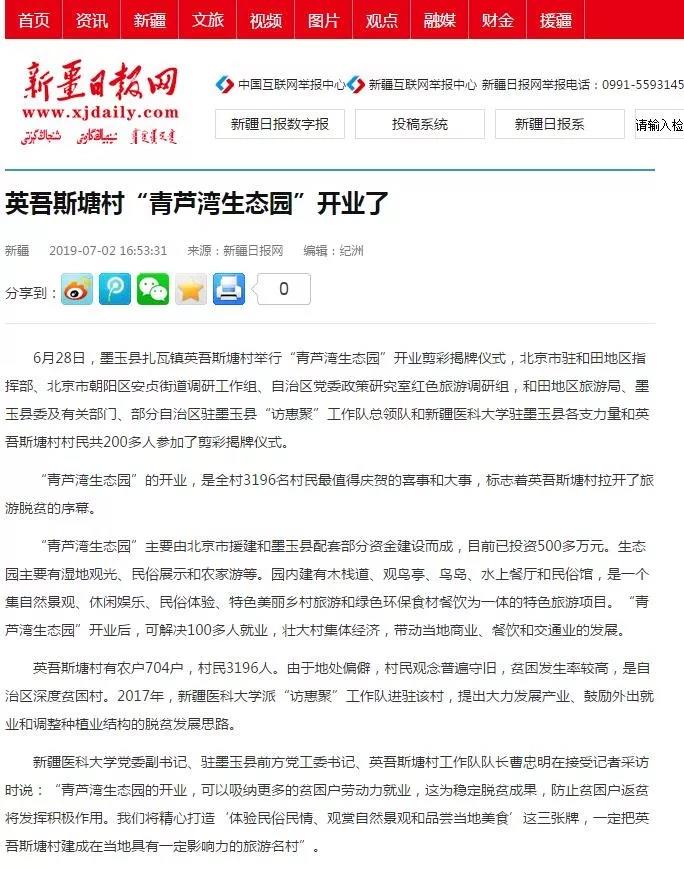 6月28日,墨玉县扎瓦镇英吾斯塘村举行“青芦湾生态园”开业剪彩揭牌仪式,北京市驻和田地区指挥部、北京市朝阳区安贞街道调研工作组、自治区党委政策研究室红色旅游调研组,和田地区旅游局、墨玉县委及有关部门、部分自治区驻墨玉县“访惠聚”工作队总领队和新疆医科大学驻墨玉县各支力量和英吾斯塘村村民共200多人参加了剪彩揭牌仪式。