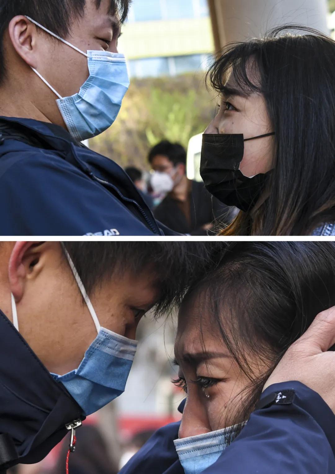 拼版照片:上图为4月23日,新疆医科大学第一附属医院重症监护室医护人员吕俊(左)解除隔离后与未婚妻王鹤团聚;下图为1月28日,在新疆医科大学院内,支援湖北医疗队队员吕俊(左)与未婚妻王鹤道别。当日,新疆首批支援湖北医疗队的医护人员解除隔离休整,与久别的同事、亲友重逢。新华社记者 王菲 摄