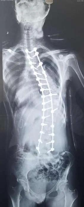 4月30日,来到了新疆医科大学第六附属医院。检查被确诊为“青少年特发性重度脊柱侧弯”。