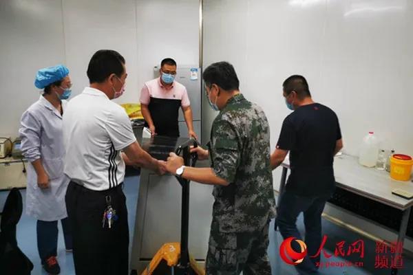 湖北核酸检测医疗队调试检测搬运带来的医疗物资设备。