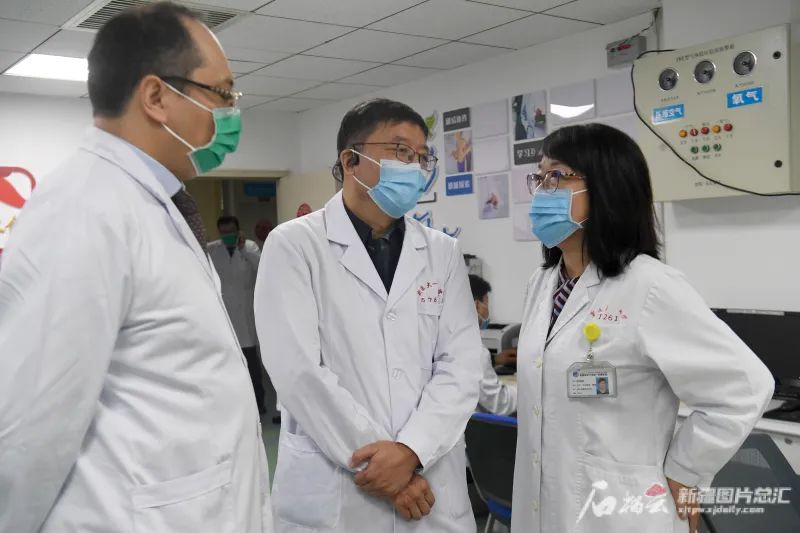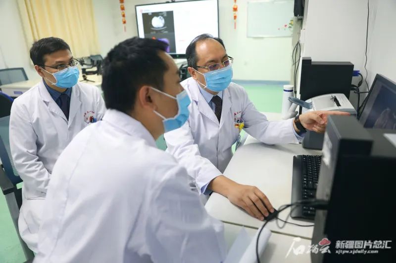 4月7日,新疆医科大学第一附属医院消化血管外科中心名誉主任温浩(中)和消化血管外科中心主任邵英梅(右),消化血管外科中心副主任、肝胆包虫外科主任吐尔干艾力讨论患者病情。石榴云/新疆日报记者 韩亮摄