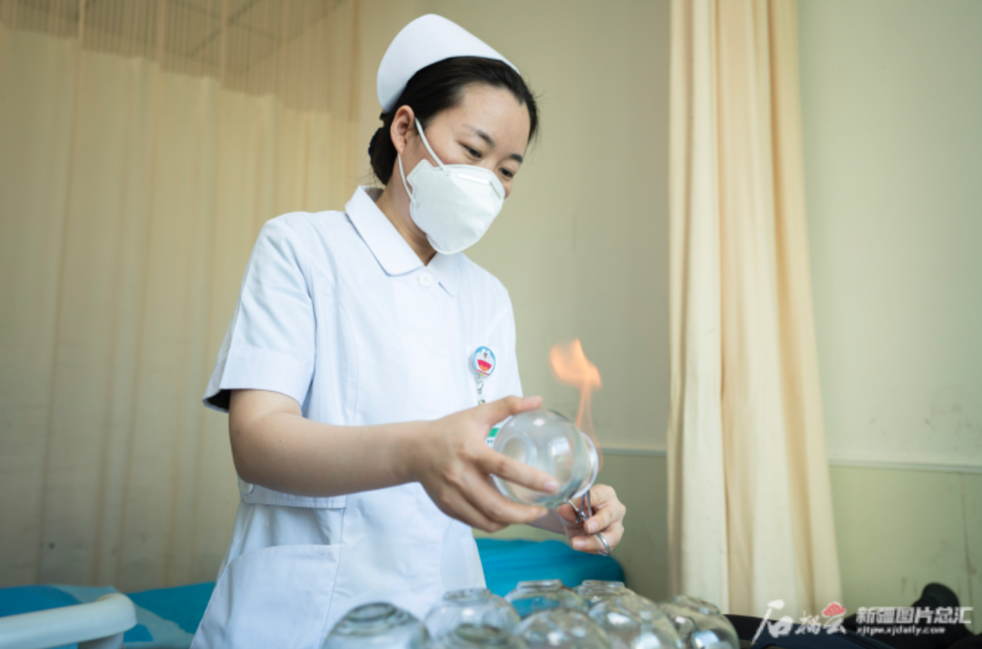 5月7日上午,新疆医科大学附属中医医院(自治区中医医院)皮肤科护士张桂荣为患者拔火罐,治疗痤疮。随着我区护理专科建设快速发展,越来越多的患者找到专科护士寻求帮助。石榴云/新疆日报记者 尹通元摄
