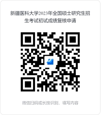 考生成绩复核一律采用线上申请方式(不接受其他形式的复核申请)。考生于2023年2月23日10:00至2月26日18:00,手机端用户请扫描下方二维码,按要求提交成绩复核申请和相关材料照片:《新疆医科大学2023年硕士研究生招生考试初试成绩复核申请表》(附件)、身份证人像面、准考证电子版。需复申请复核多门考试科目成绩者,须多次提交信息;同一科目考生只可提交一次复核申请;逾期不再受理。