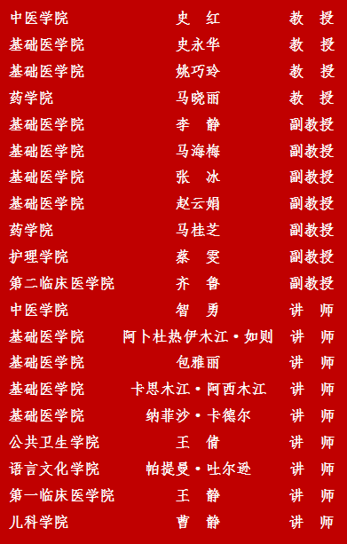 近日,新疆医科大学2022年度校级本科教育教学名师和教学能手评选结果出炉。经个人申报、学院资格审查、遴选推荐和学校评审,综合免评选推荐和学校学科专业发展实际,最终评选出教学名师16名,教学能手20名。